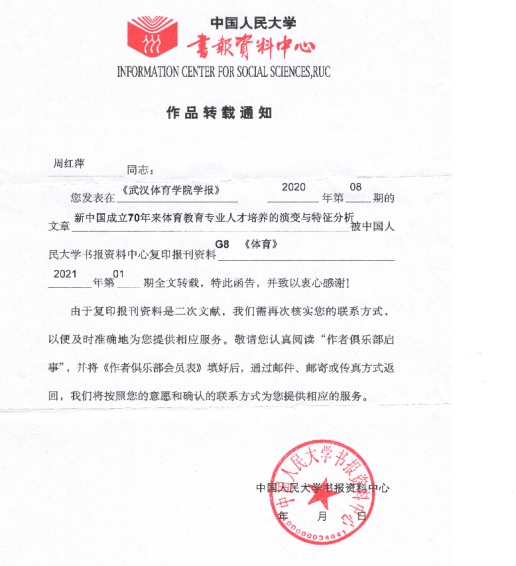 [通讯员 张娟]日前,从中国人民大学传来喜讯——公司周红萍老师撰写的论文《新中国成立70年来体育教育专业人才培养的演变与特征分析》,系统的研究了体育教育专业建国70年来,在发展规模、专业定位、培养方案、课程设置、教学模式等人才培养方面特征与演变规律,呈现体育教育专业发展历史的脉络,是推动体育教育专业发展和改革的一项基础性工程。(原文发表于《武汉williamhill英国官网学报》2020年第8期)被人民大学复印资料G8《体育》2021年第1期全文转载。